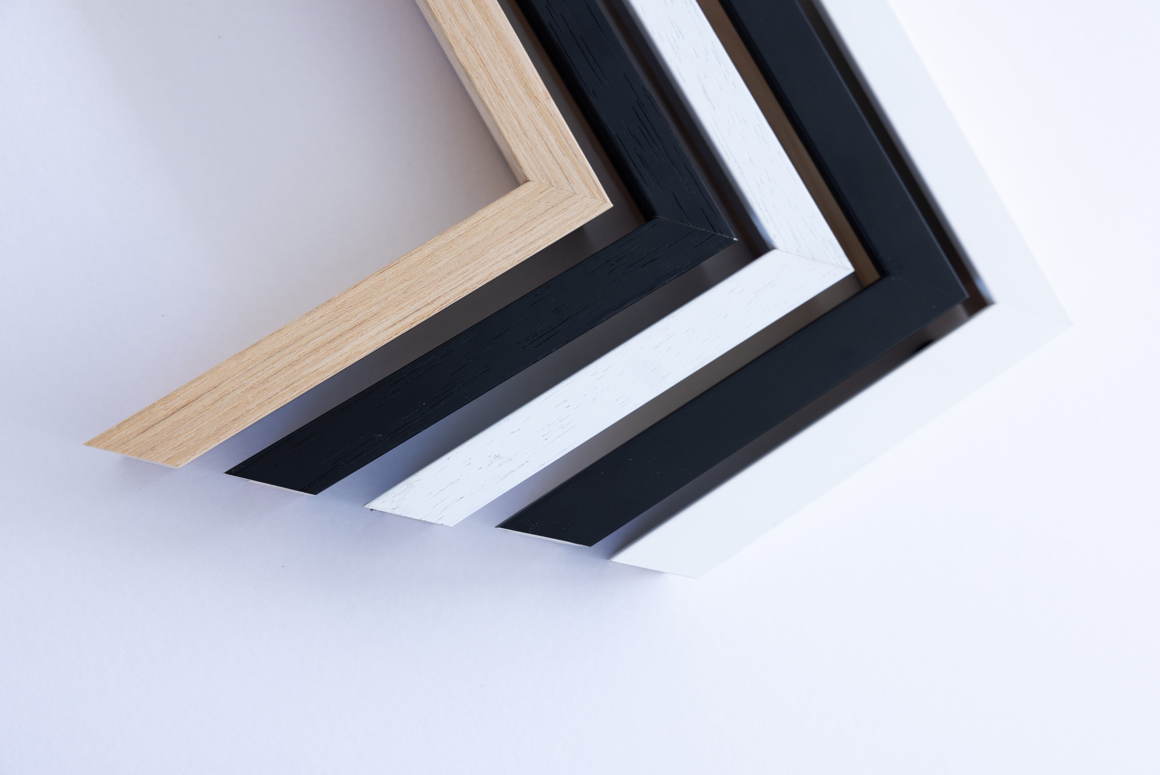 - White Timber Frames: Soft texture that suits organic artworks and relaxed spaces.